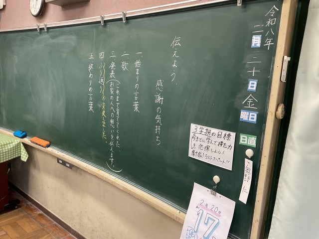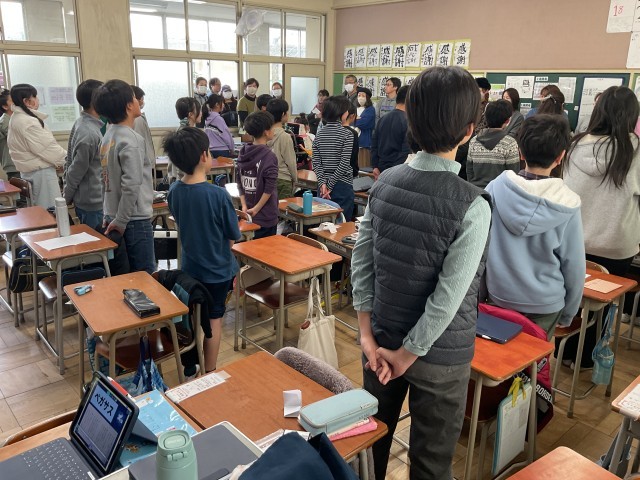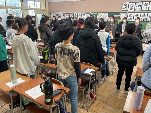お忙しい中、たくさんの方々にお越しいただきありがとうございました。教室に収まりきらないほどの保護者の方々に参観いただき、子どもたちもとても嬉しかったことと思います。まずは、保護者の方を振り返っての合唱から始まり、一人一人が前に立って感謝の気持ちを述べる発表が行われていきました。素直に感謝の気持ちを述べる姿にとっても感動し、思わず涙がこぼれそうになりました。発表者自身やそれを聞いている保護者の方も感極まっておられる方々がたくさんいましたね。その後の、PTA行事や懇談会にも引き続き参加して頂き、ありがとうございました。