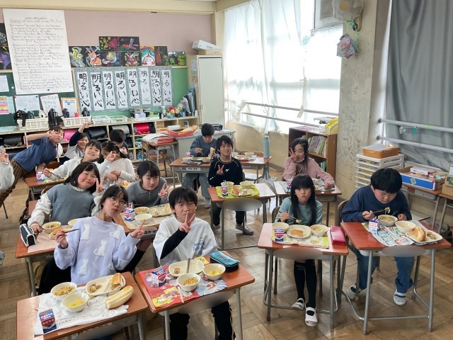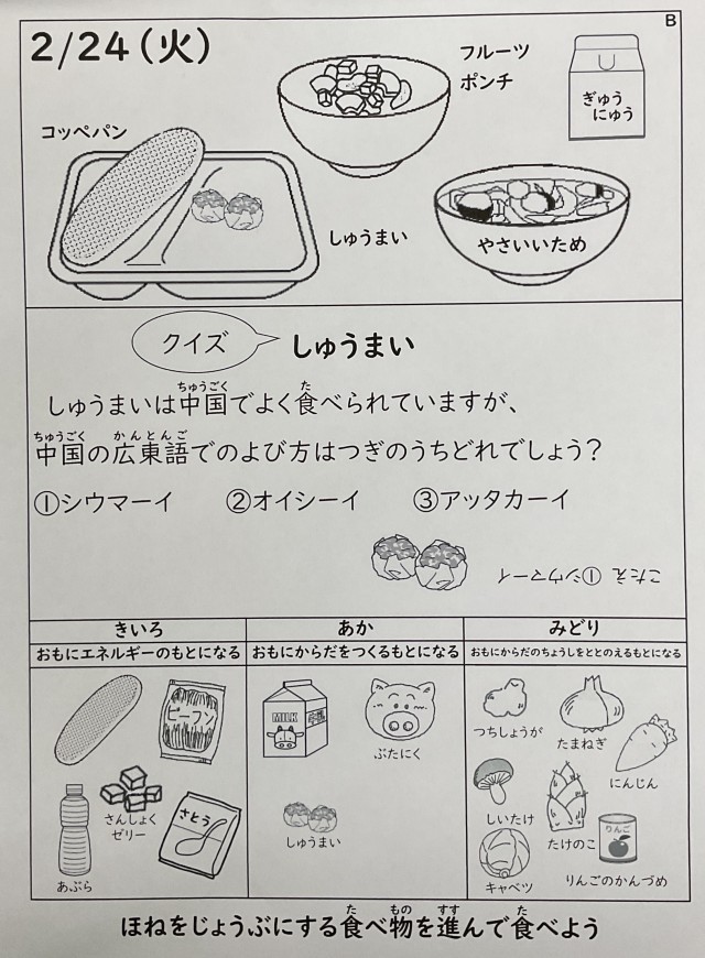 2/24(火)おいしい給食 しゅうまい、フルーツポンチ 公開日 2026/02/24 更新日 2026/02/24 4年生 今日の給食の時間は4年生の教室に行きました。しゅうまい、フルーツポンチとおかわりの競争率が高いメニューでしたが、先生とじゃんけんしたり、譲り合ったりしながら平和におかわりをしていました。 +5 いいね(0)