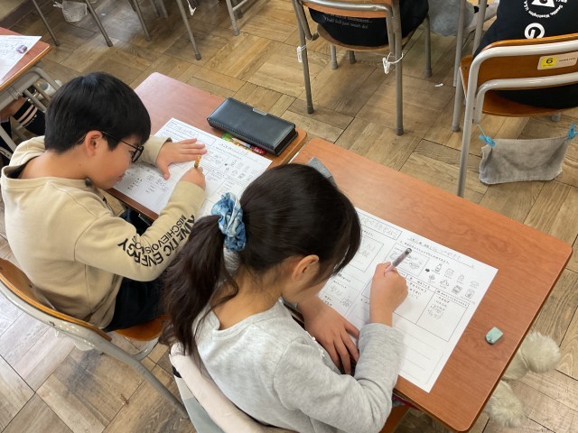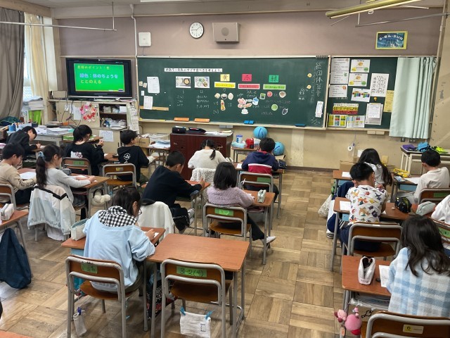 栄養教諭が3年生へ食育の授業を行いました。食べる理由を考えたり、食べ物の3つの働きについて学習したりしました。次に、昨日の給食の献立を基にそれぞれの食材が「エネルギーになる」「体を作る」「調子を整える」の、どの働きをしているか分類して考えていきました。