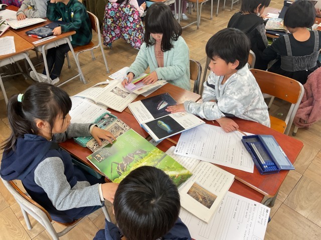 2/26(木)1年生 どうぶつのちえについてしらべよう 公開日 2026/02/26 更新日 2026/02/26 1年生 国語の『こどもを まもる どうぶつたち』という説明文を学び、興味のある動物の知恵について調べていました。1年生担任が学校図書館司書と相談して見繕った図鑑が大活躍していました。班に2冊の図鑑を、なかよくいっしょに見たり、順番を待ったりして揉めることなく上手に読んでいました。 +3 いいね(0)