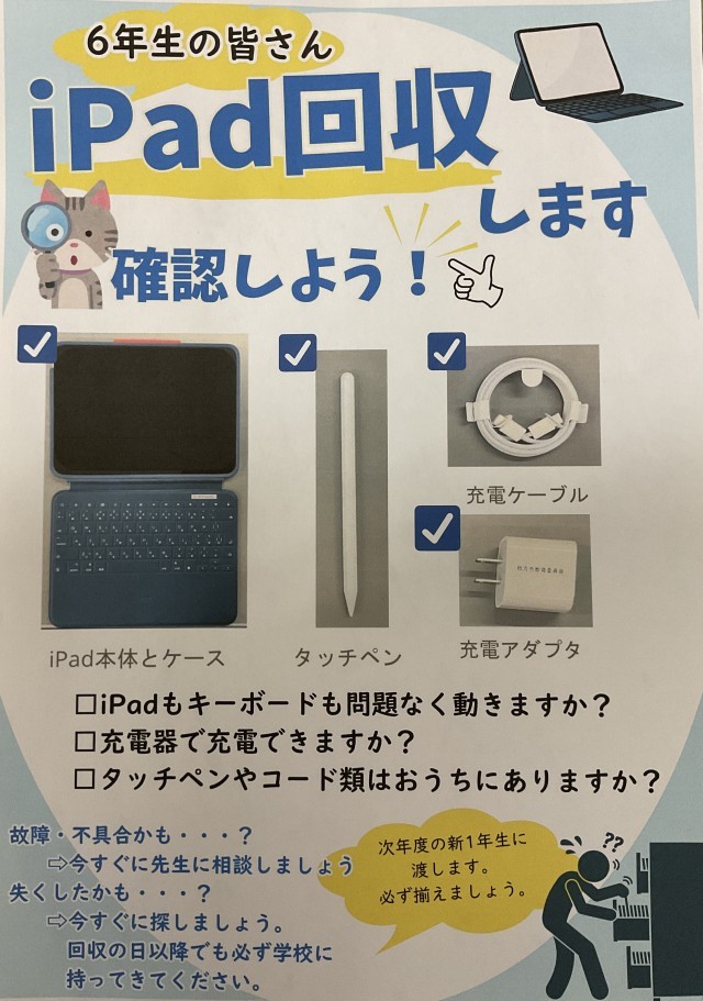 2/26(木)6年生1人1台端末の回収、新1年生への貸与に向けて 公開日 2026/02/26 更新日 2026/02/26 お知らせ・緊急連絡 6年生の小学校生活も残りわずかとなり、タブレットの回収を予定しています。3月2日(月)に回収し、新1年生への貸与に向けて端末のリセット等の準備を行います。6年生の保護者の皆様、ご家庭で【動作確認】や【貸与品の紛失、破損等】をご確認ください。 いいね(0)