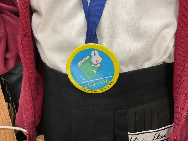 さらに、図書委員さんの目印のバッジ?メダル?を作成しています。低学年の児童にも図書委員が誰なのかわかりやすいですね。【としょかん だ〜いすき】の子が増えて欲しいです!