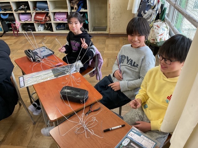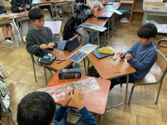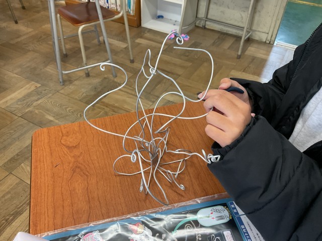 ねじったり、曲げたり、鉛筆を巻きつけて形どったり、モールで飾り付けをしたりしています。子ども達の自由な発想は見ていてとても楽しいです。どんな作品が完成するでしょうか?