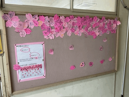 養護教諭が企画して児童のみなさん(先生達も)に書いてもらってきた、花びらの寄せ書きが満開です。