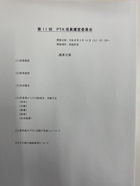 3/14(土)第11回PTA役員運営委員会がありました。 公開日 2026/03/14 更新日 2026/03/14 学校の様子 本日10時に家庭科室で今年度最後のPTA役員運営委員会を開催しました。次年度のPTA活動についてのお話しをしたり、今年度の活動を振り返ったり、この1年間の学校行事等へのご意見をいただいたりしました。PTA役員さん、運営委員さんにおかれましては、土曜日にも関わらず毎月の会議へのご出席、本当にありがとうございました。 いいね(0)