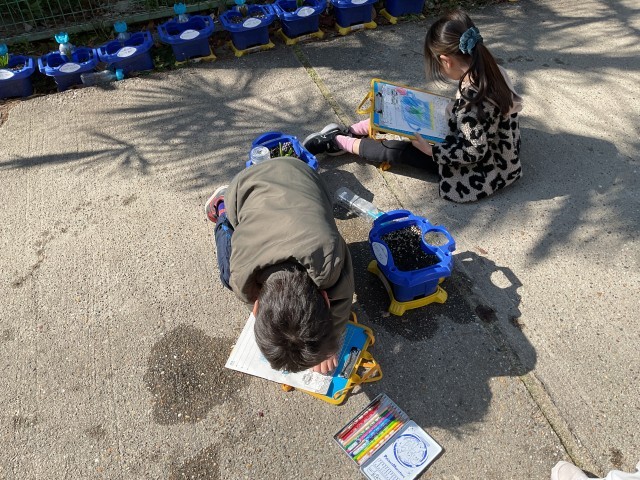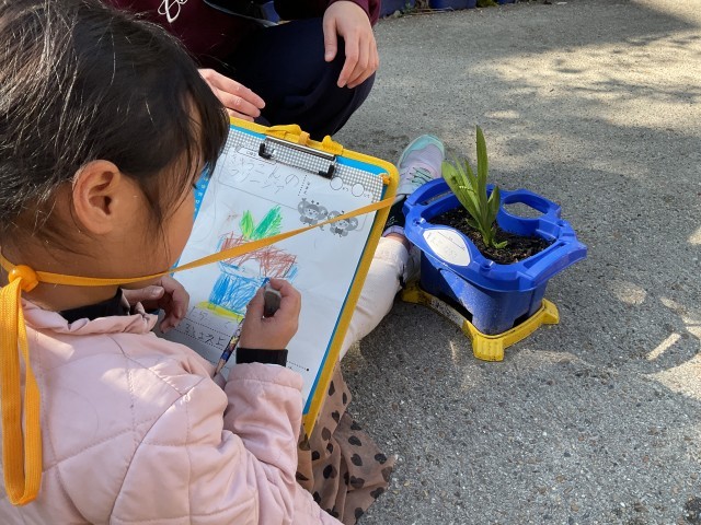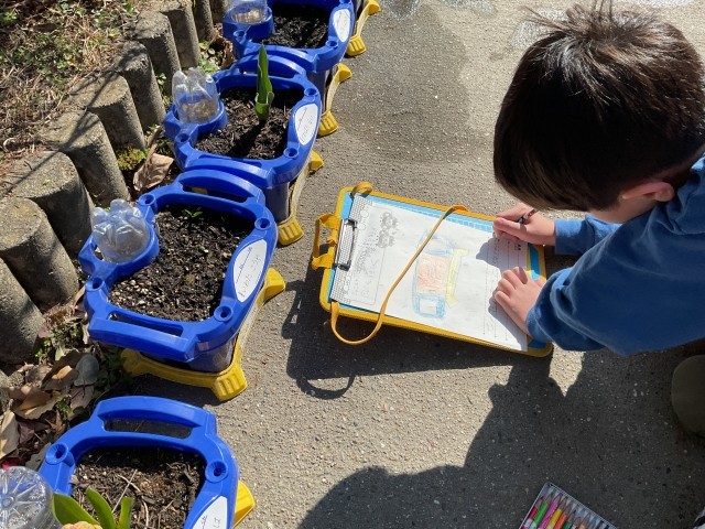 11月に自分たちで注文して、植えた球根の観察をしていました。
