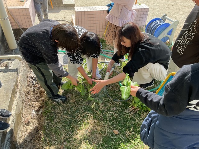 体育倉庫裏の学年の畑でできたほうれん草を収穫したり、まだ収穫できないお野菜に水やりをしたりしました。
