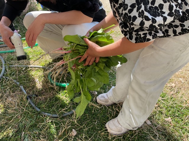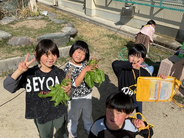 収穫したほうれん草はきちんと泥を落として、教室でなかよく持ち帰る人を決めてくださいね。