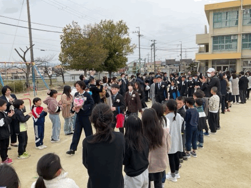 教室での最後の授業と記念写真の撮影を終えて、保護者の方や留守家庭児童会の児童達が待つ運動場の花道を歩きました。花道を歩いたあとは友達や先生達と運動場で記念写真です。なんとか最後まで雨に降られずに終えることができました。本当によかったですね。