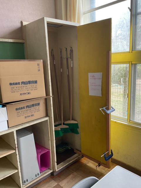 手始めに掃除用具入れの扉の修理です。次年度使う学年のために、順次修繕していってくれています。
