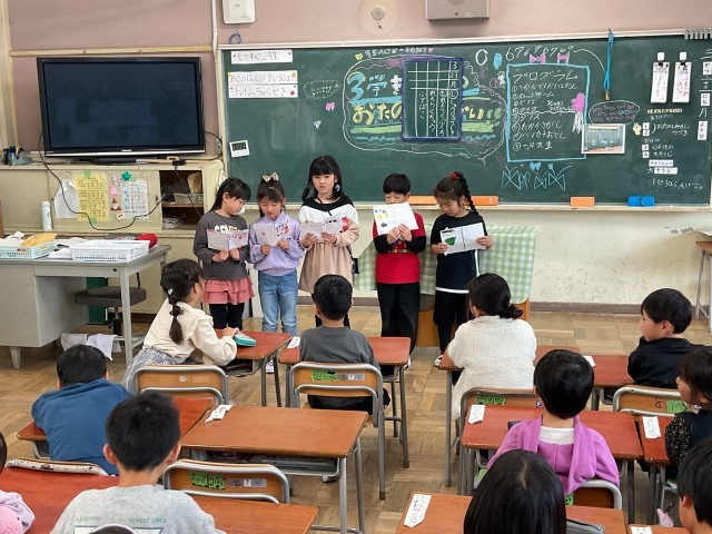 3/23(月)1年生 お楽しみ会の様子 公開日 2026/03/23 更新日 2026/03/23 1年生 ダンスの披露やすごろくをしていました。また、教室内にお宝を隠して宝探しもしていました。綿密に準備してきたことがよくわかるお楽しみ会でした。きちんと台本を作って、役割分担をして、堂々と進行している子ども達ばかりで大きな成長を感じました。 +2 いいね(0)