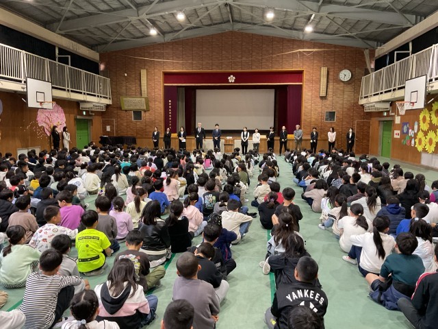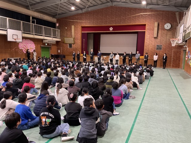 修了式に引き続き、この3月で本校を去られる先生方から子ども達へお別れの挨拶をしていただく離任式を行いました。たくさんの先生方が前に並ばれ1人ずつ挨拶をいただきました。お別れを惜しみ悲しくて泣いている子もいましたが、みんなしっかりと最後のお話を聞くことができました。最後に、みんなでお礼の気持ちを込めて「ありがとうございました」と伝えることができました!