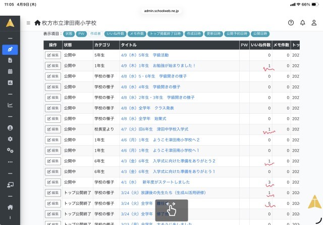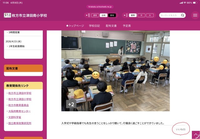 津田南小学校ブログをご覧頂いている方々、いつもありがとうございます。始まって間もない中でアップ数も少ないにも関わらず、1日に300件を超えるアクセスを頂きありがとうございます。また「いいね」ボタンを押して頂いている方もいて大変励みになります。私も知りませんでしたが、「いいね」ボタンは記事の右下にあるようです。今後とも、できる限り毎日学校の様子をお知らせしていきたいと思います。また、ブログを見れば行事予定や学校の様子、学校だよりなどいつでも確認できるようなブログにしていきますので、今後ともよろしくお願いします。
