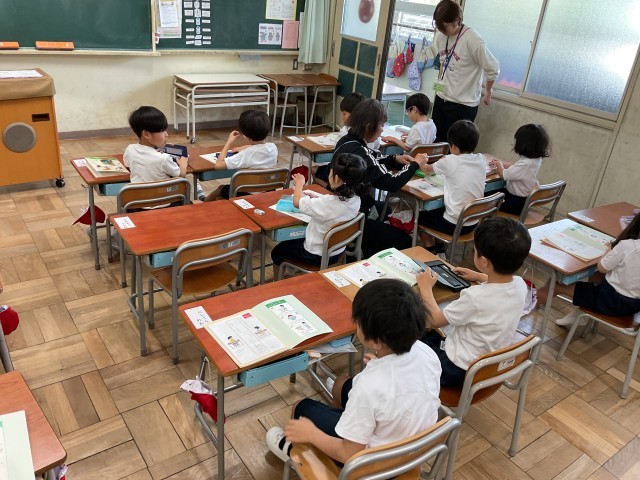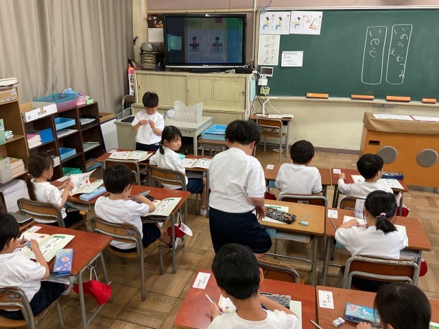 初めてのお勉強で自分の名前を書きました。まだ、ひらがなを習っていないのにみんな上手に書いていてびっくり!よくできましたね!