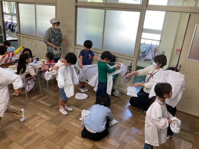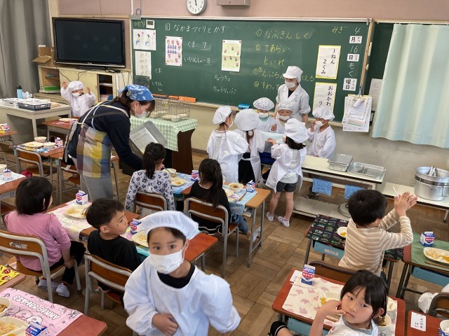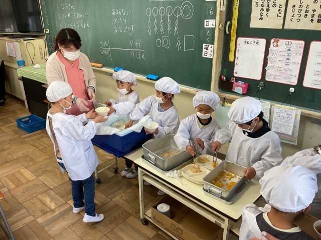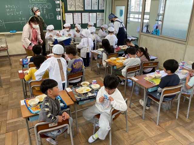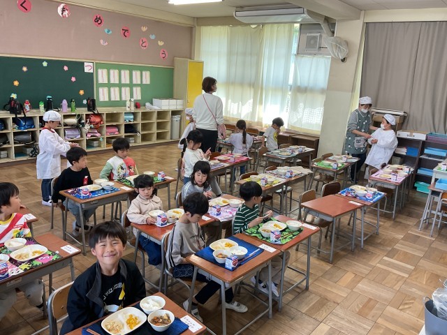給食が始まって2日目の1年生。運搬や配膳など、頑張って給食当番に取り組んでいました。終わった後の後片付けも上手にできました!