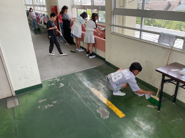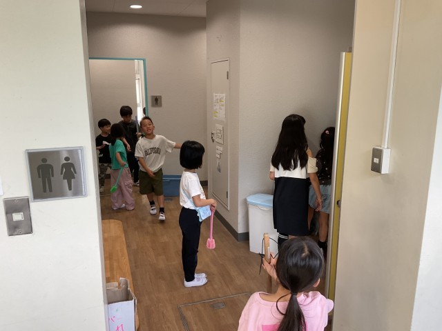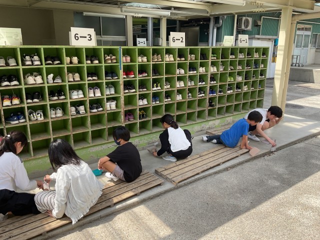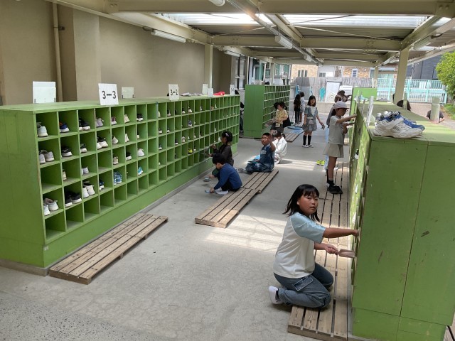 先週から始まったお掃除タイム。担任の先生のお話からも清掃活動に一生懸命取り組んでいることを聞いたので、掃除時間に学校中を見て回りました。共用で使用する廊下や靴箱周りやトイレなども頑張ってきれいにしていました。