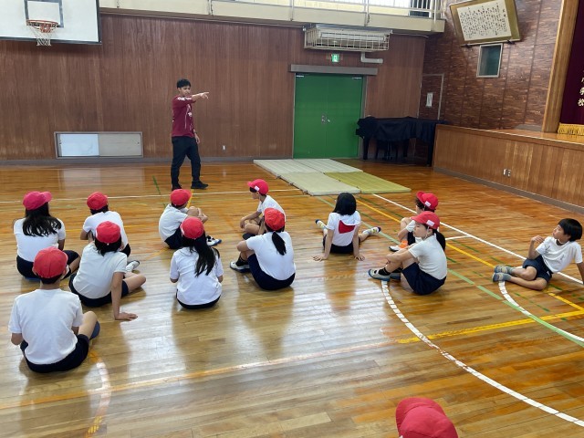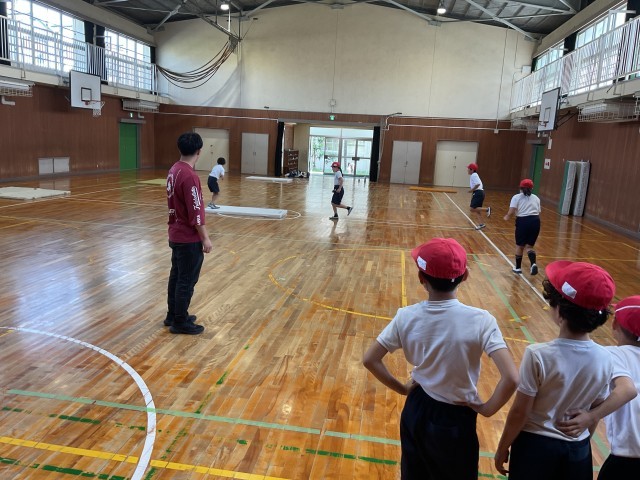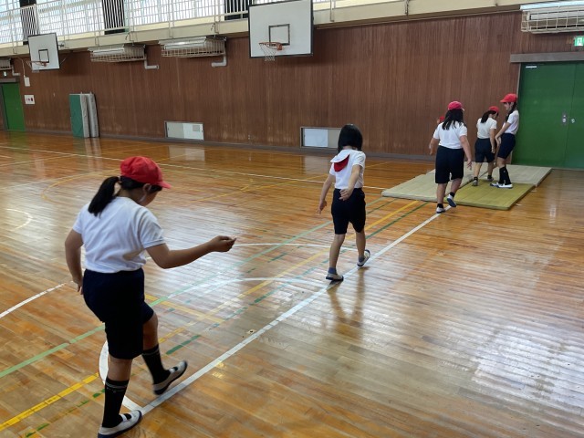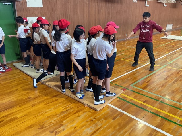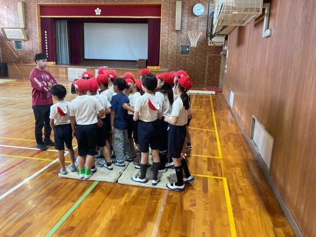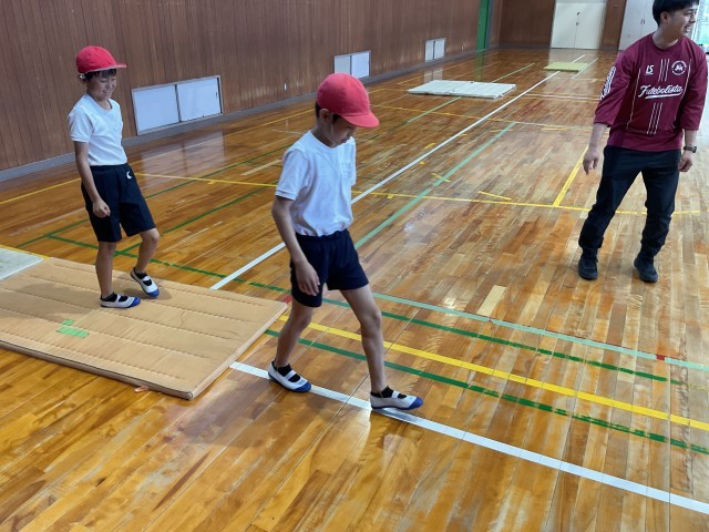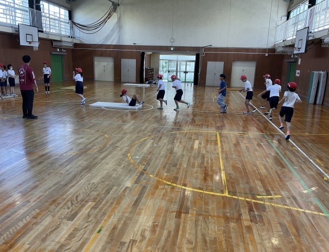 体育ではマット運動にチャレンジ。先生の説明をしっかり聞いて楽しそうに取り組んでいました。マットを島に見立てて、白いラインテープだけを頼りに島から島へと落ちないよう渡っていきます。その途中にあるマットでは、自分ができる技を披露して次の島へと渡っていきました。