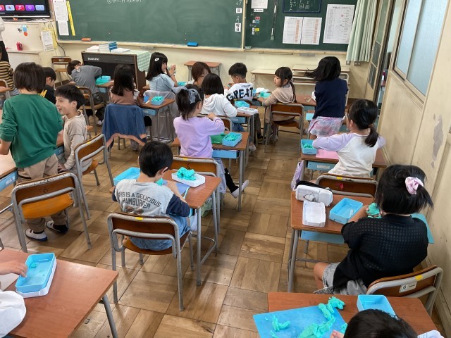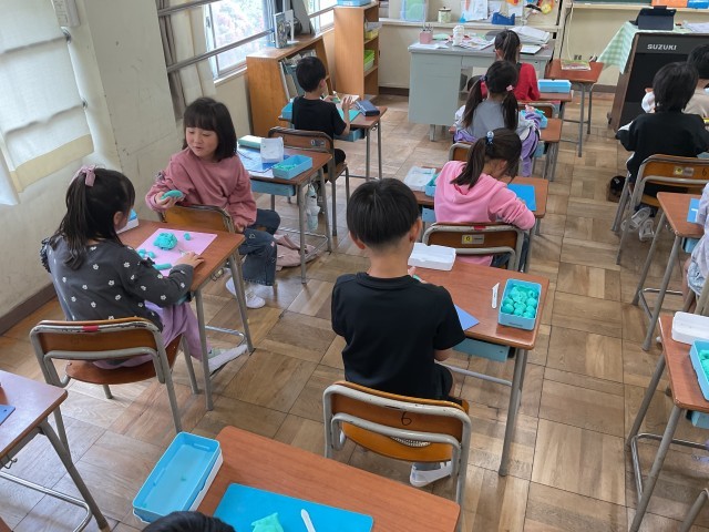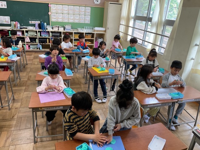 粘土を使って創造活動。広げたり、丸めたり、穴を開けたりして「むぎゅたん」を作っています。思い思いに作りたいものを夢中で作成していました。