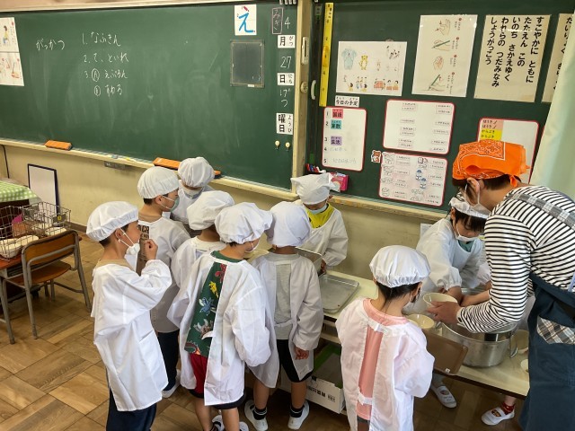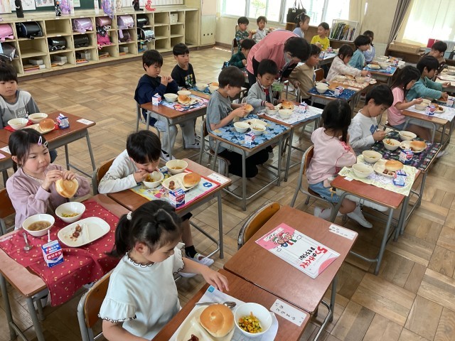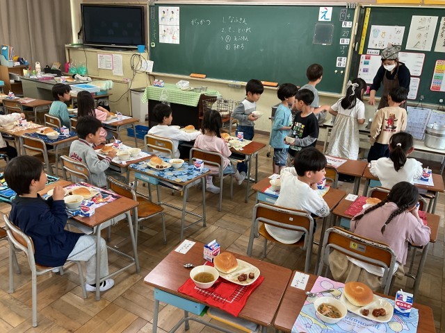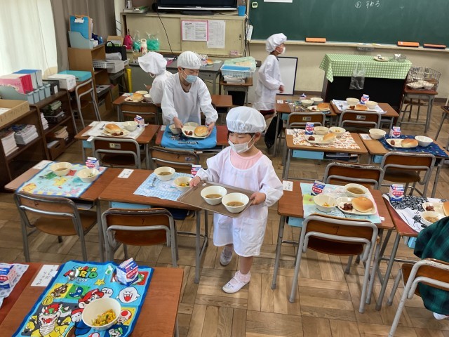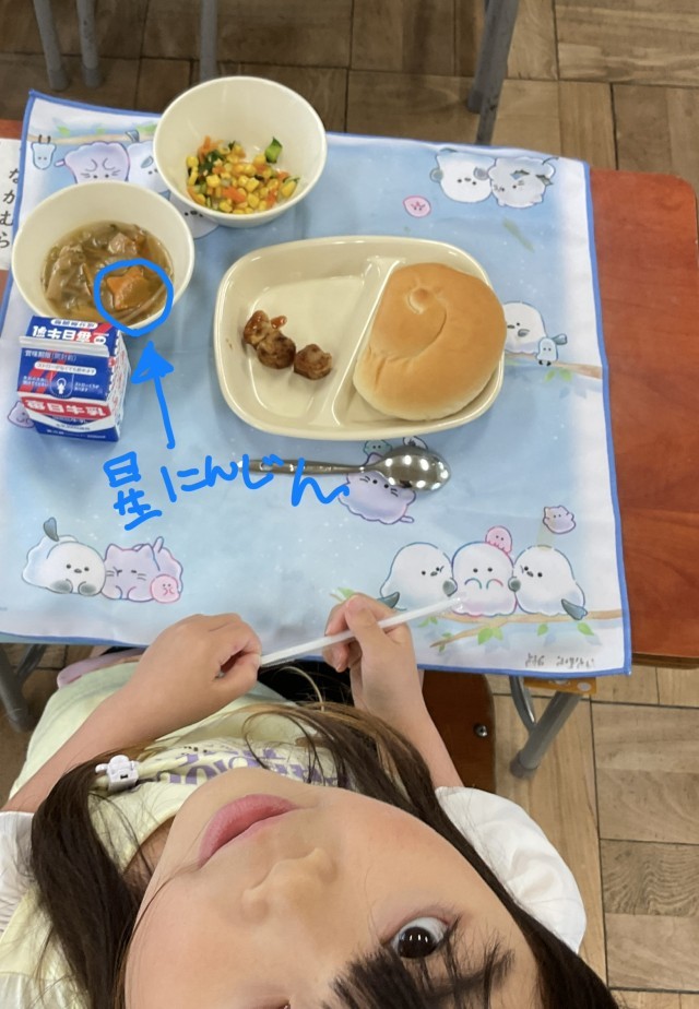 1年生のみんなの給食当番も随分と慣れてきた様子で、準備や片付けやエプロンたたみが早く上手になってきました。そして、今日の給食の大おかずのスープには「星型の人参」が入っているよと教えてくれました!ラッキー人参だね!