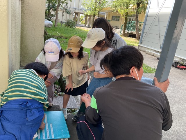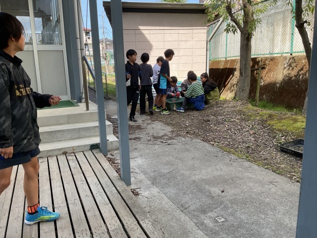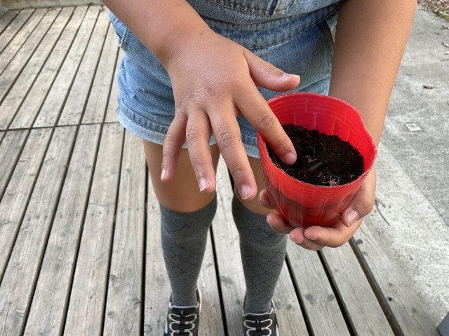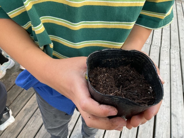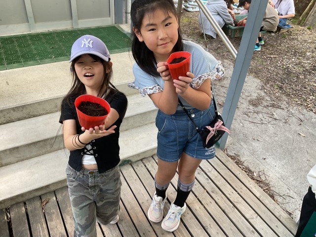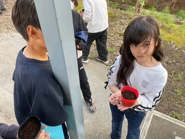 ビニールポットに土を入れて、そこにヘチマやヒョウタンの種を植えました。どちらを植えるかは自分で決めて、それぞれ赤と黒のポットで種を育てます。植え終わったら、先生に見せにきてくれました。実際に見たり触ったりして、学習できるのが理科の醍醐味ですね!早く芽が出るといいですね!