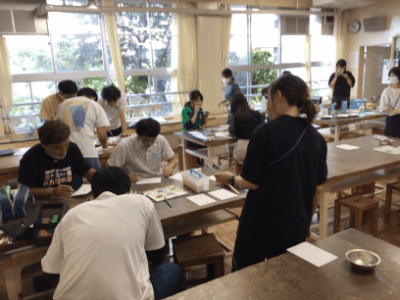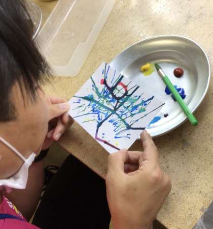 校内研究協議(図工)の後に職員全体で実技研修が行われました。絵の具を使った様々な技法を体験しました。子ども達が興味を持って取り組めるヒントがたくさんあったようです。