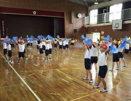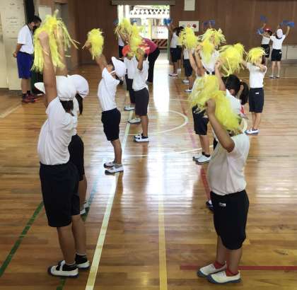 手にあざやかなポンポンを持ってひとつひとつの動きを確認しています。