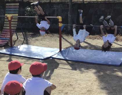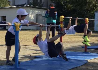 鉄棒では練習してきた技をグループで確認していました。タブレットで確認します。