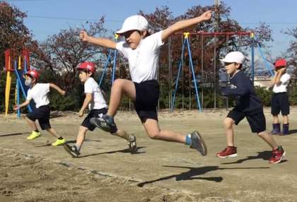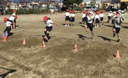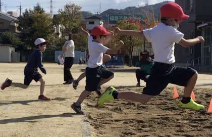 走り幅跳びでは目標のコーンに向かって力強く跳んでいます。先生が伝えている「バンザイ」が大事ですね。
