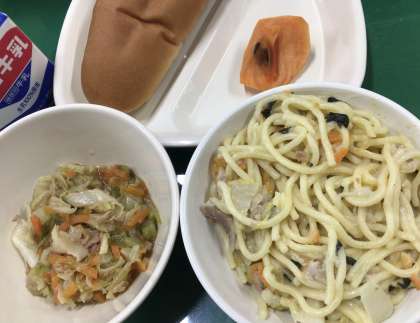 【献立】冬野菜の豆乳スパゲティ・ツナとキャベツのソテー・かき・コッペパン・牛乳