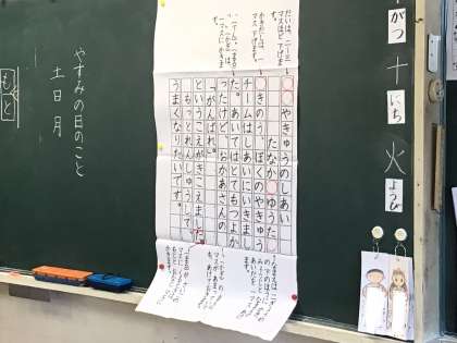 ひらがな、カタカナ、そして漢字と新しいことをたくさん学ぶ1年生。今日は、作文の書き方を学んでいました。