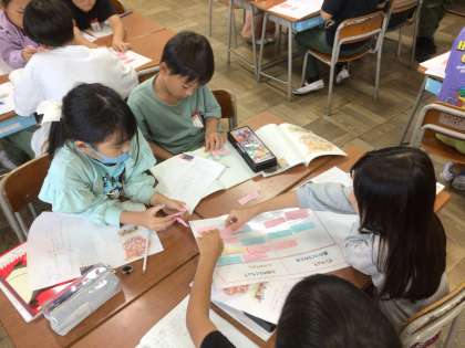 子ども達は家でもこの本を読んで、自分のワークシートに書き出してきました。シームレスな学びですね。また、付箋を使って自分が調べたことをKJ法のように書き出し、みんなで話し合いながら、まとめたり、比較したりしました。相手の話をしっかり聞いて、まとめあげていました。