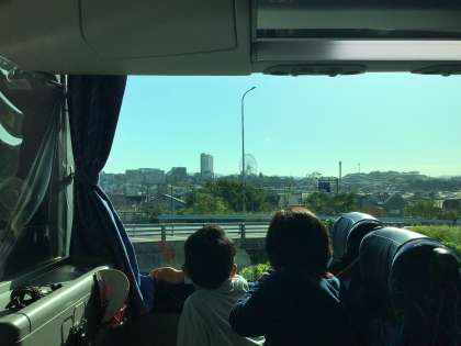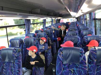 明治なるほどファクトリーへ向かう移動の中で市内めぐりの学習です。