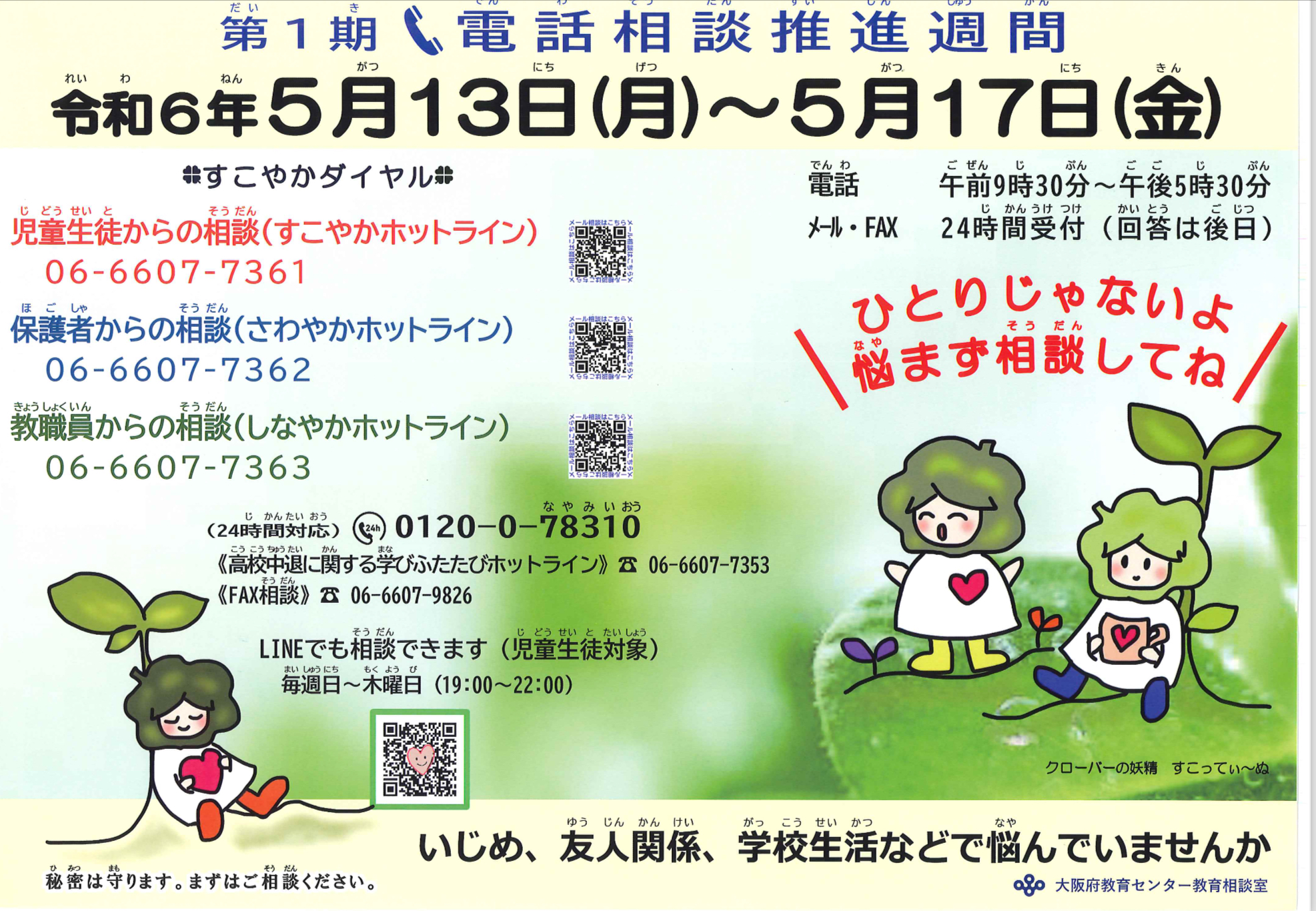 5月13日(月)いじめ 友人関係 などで こまっていませんか 公開日 2024/05/13 更新日 2024/05/13 お知らせ・緊急連絡 🫱電話相談 本日から、電話相談推進週間です! みなさん、ともだちかんけいでこまっていませんか? みなさん、いじめにあっていませんか? でんわでそうだんできるところがあります。 いいね(0)