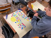 まずはクレヨンで色とりどりの明かりを描き、墨汁で幹や枝を描いていきます。豆太が怖...