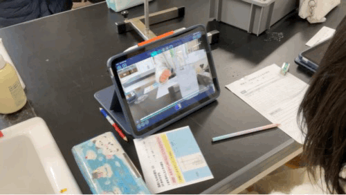 寒剤(水と氷と食塩)を使って試験管内の水を凍らせる実験です。その様子をタブレット...