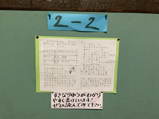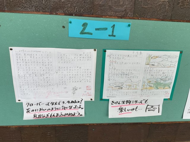 本校では、毎週金曜日に「くず北ホームワーク」を探求学習として取り組み、月曜日に「くず北ホームワーク交流会」を行なっています。渡り廊下には、各クラスの好事例を張り出すコーナーがあります。