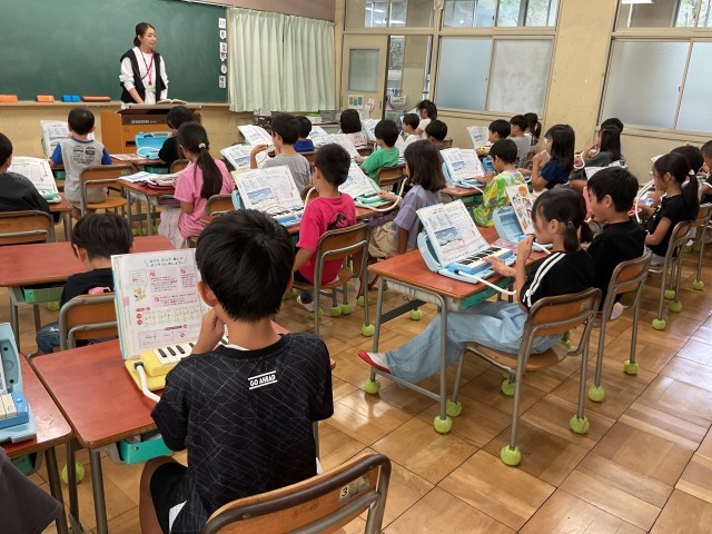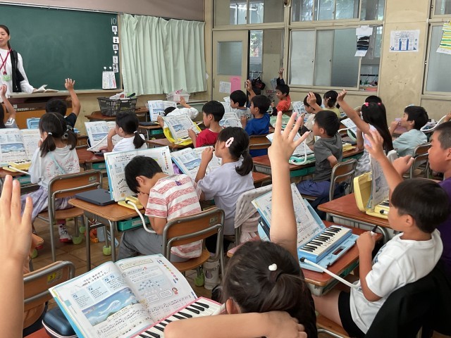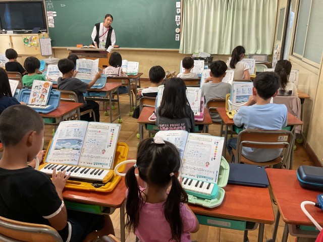 2年生の音楽科で器楽「鍵盤ハーモニカ」の練習です。鍵盤ハーモニカの指使いを意識しながら、テンポを速くしたりゆっくりしたりしながら「できた!」「もっと吹けるよ!」と自信満々で楽しんで練習していました。