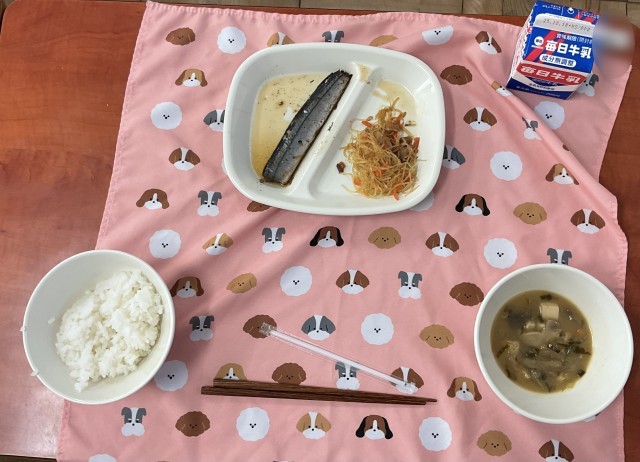 10月10日給食の様子です。今日の献立には秋刀魚でした。1年生は給食で初めて秋刀魚を食べました。