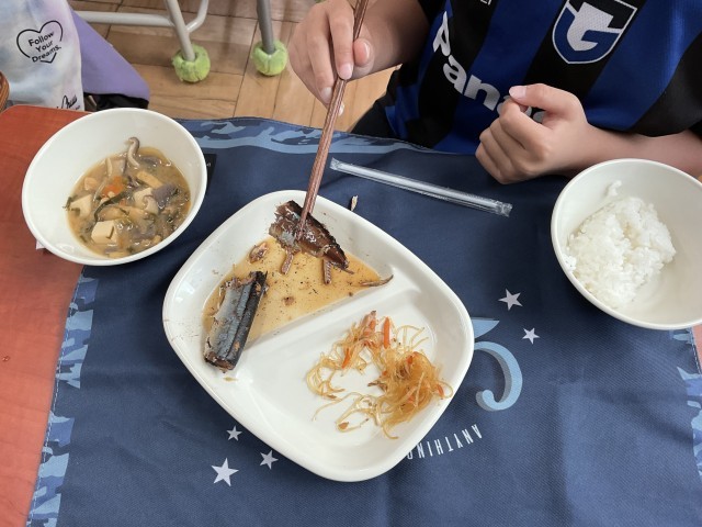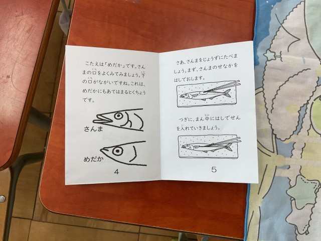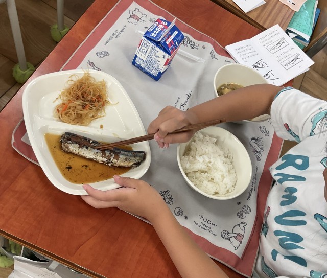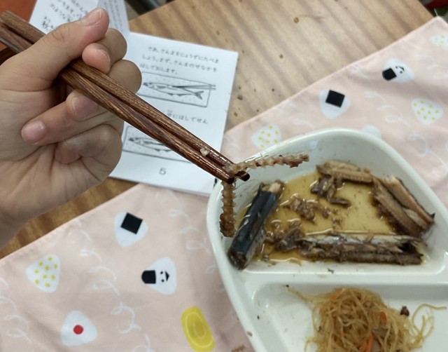 栄養教諭の先生から魚の食べ方を授業で学習し、今日はカードを見ながら秋刀魚をお箸を使って食べました。
