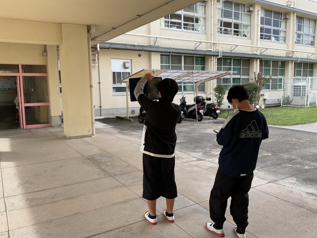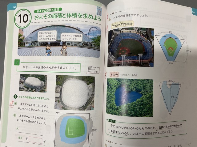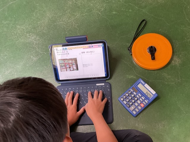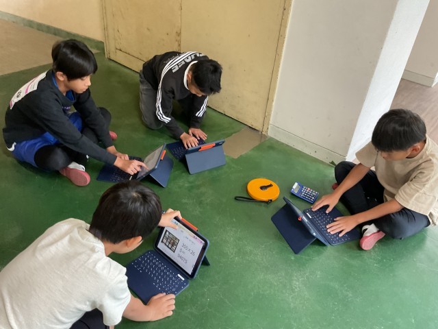 校内を見て回っていると、6年生が何やら作業をしています。その手には巻き尺と電卓。何の授業かと思ったら「およその面積と体積を求めよう」の授業でつけた力を、実際に身の回りのいろいろなものに応用して、測ったり計算をしたりしておおよその面積や体積を求めていました。