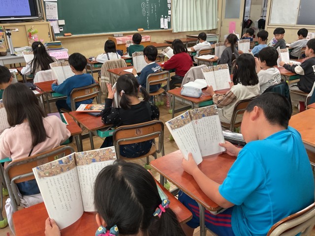 2年生では「かさこじぞう」の単元に入っています。音読では昔話の世界に浸りながら順番に音読をしていました。友達の音読の工夫を感じながら、静かに耳を傾けて聞いている集中力が素敵でした。これから昔話の「良さ」や「面白さ」を見つけながら、仲間と先生と共に学んでいきます。