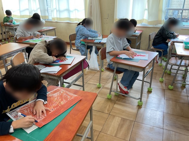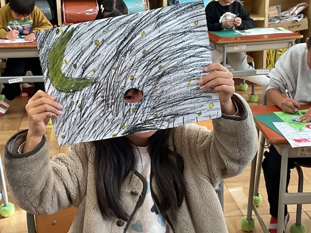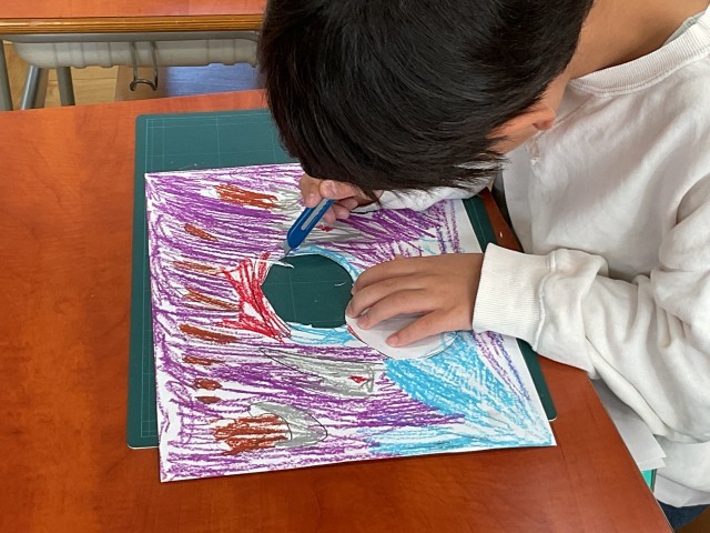 「あなでつながる2つの世界」の作品作りです。今日は、いよいよカッターナイフの使い方を習い、書いた絵にカッターナイフで切って穴を開けて行く日です。怪我をしないようにしっかりとカッターナイフの使い方の説明を聞いた子どもたちは、やや緊張した雰囲気で静かにカッターナイフを動かしていました。