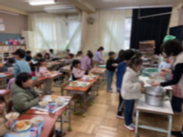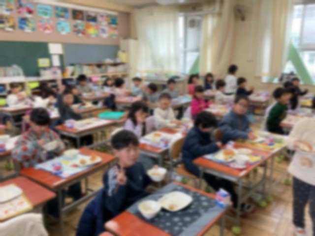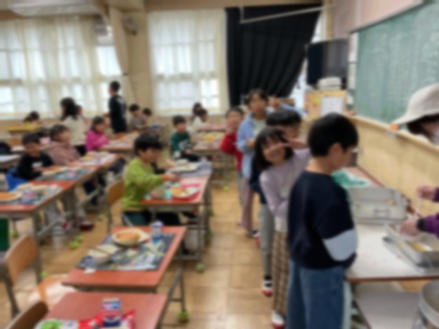 低学年の給食の様子です。低学年では子どもたち同士の話題に給食のメニューがよく出ます。給食で食べる様々なメニューを楽しみに、献立表を見ながら「今日はチゲスープやねんて」「チゲってなに?」「キムチやねんて」「えー!辛いんかな?」と話していました。苦手なおかずは「これだけなら食べられる」と先生と相談しながら減らすこともしています。給食の時間になり、教室に様子を見にいくと、おかわりに並ぶ行列も見られ、「チゲスープ、全然辛くなかったよ!」と自分のお腹の容量と相談しながらモリモリとおかわりする姿が見られました。