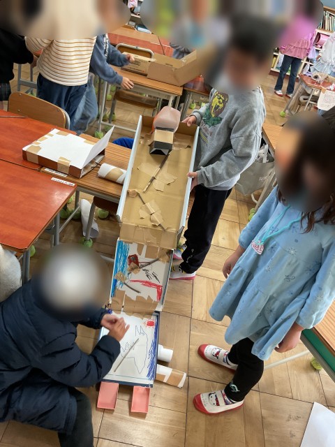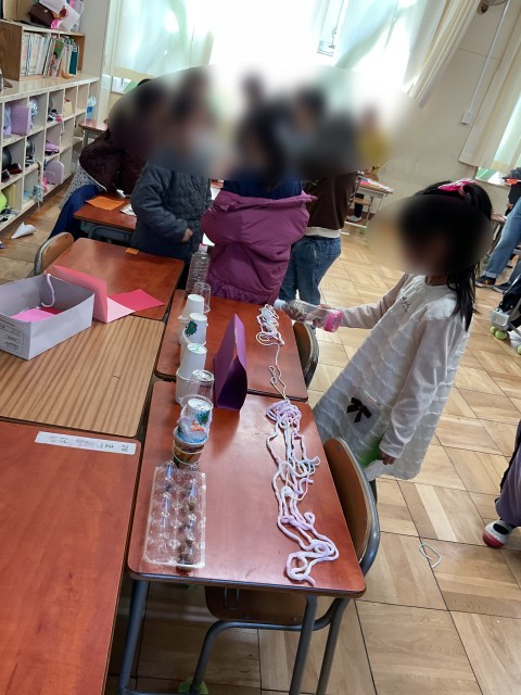 1年生の生活科では、おもちゃづくりをして1組と2組で交流して遊びました。自分たちで材料も作り方も遊び方も話し合い、一生懸命考えた自慢のおもちゃです。今日は教室を行き来して遊んでいました。