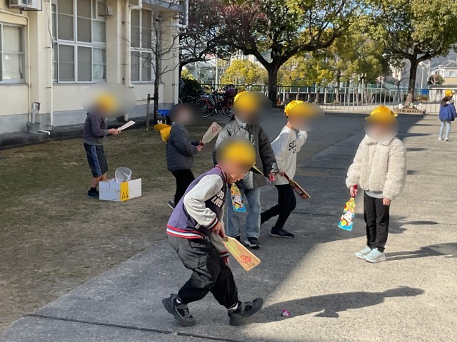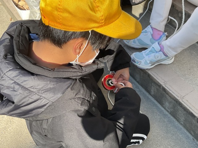 地域の方に教えてもらったむかし遊びの羽子板やこま回しがだんだん上手になっていきました。できないからとやめてしまってはできるようになりません。繰り返し挑戦しているうちに何回かに一回はコマが回るようになってきて、だんだん楽しくなってきます。羽子板も打ち返したり打ちあえるようになってきました。根気のいる遊びも経験の中で大切だと感じました。