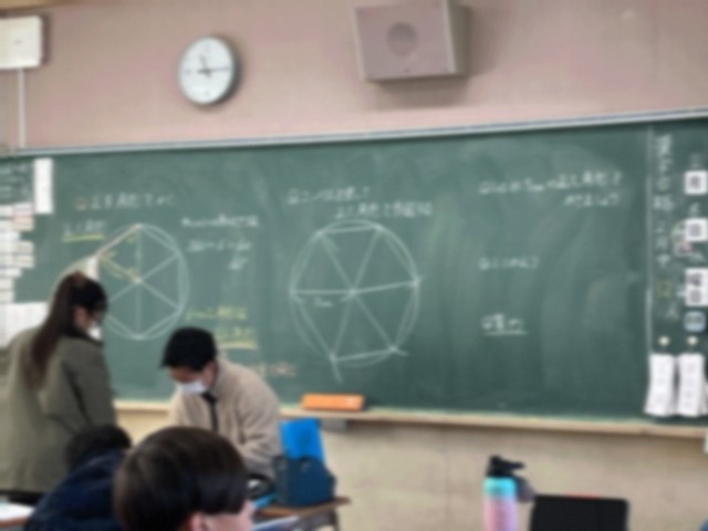 5年生の算数では、コンパスを使っての「正六角形」の作図でした。作図は楽しく作業に取り組んでいる様子の児童が多く、コンパスを使ってスムーズに作図を行っていました。