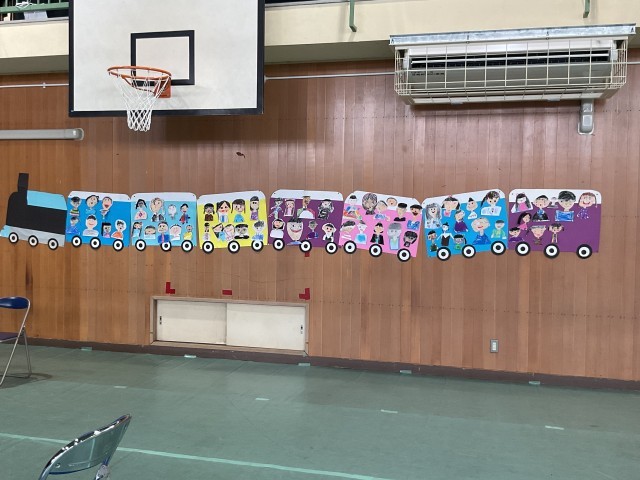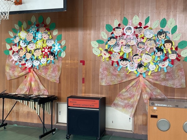 体育館では、連日、6年生を送る会の練習や卒業式の練習が行われています。卒業式に列席できない在校生は、6年生を送る会で6年生とお別れをする機会を持ち、体育館の壁面には自分の笑顔を張って式場をおめでとうの気持ちで飾ります。