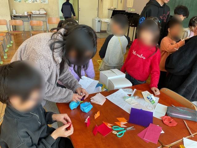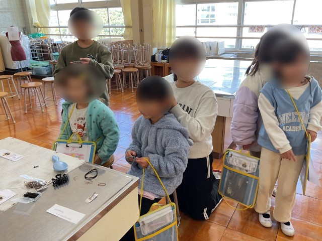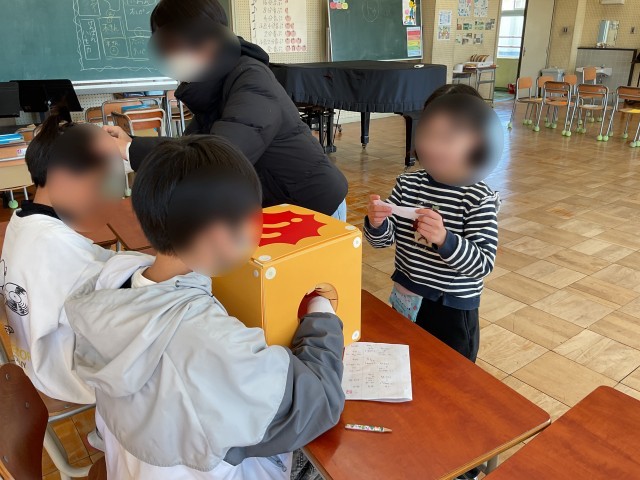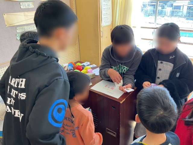 1年生と6年生のきょうだい学級では、6年生がいろいろ考えたコーナーに、きょうだい学級の1年生を招いて「くず北バザール」を行っていました。