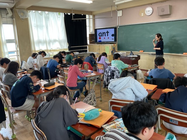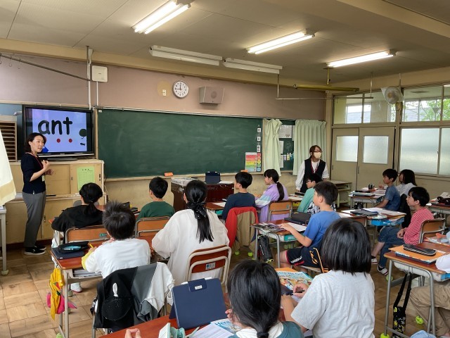 「ant」という単語を使い、a、n、t、の発音を一つずつ確かめながら、音とつづりのつながりを意識して学習しました。