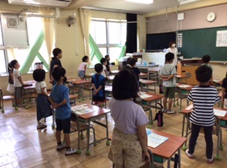 はじめに校歌を歌い、今日のめあて「歌にあわせて リズムをうとう」を「しろくまのジェンカ」の曲でしていました。「たん うん、たん うん、たん たん、たん うん」を手でうちリズムを味わっていました。